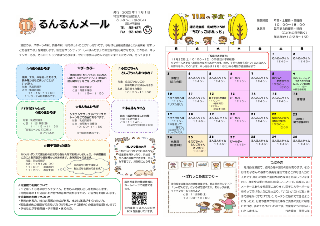 るんるんメール11月号(令和7年度) 2025 10/25 るんるんメール 諏訪児童館 2025年10月25日 るんるんめーる(諏訪)令和7年度11月号(カラー版)ダウンロード るんるんメール 諏訪児童館 ぱれっとあきまつり開催のお知らせ 関連記事 ぱれっとあきまつり開催のお知らせ 2025年10月10日 9月の児童館 2025年10月10日 あそびのひろばIN水谷公民館 2025年10月1日 じどうかんだより秋号(令和7年度) 2025年9月30日 9月のちびっこぱれっと 2025年9月30日 るんるんメール10月号(令和7年度) 2025年9月29日 本日の遊戯室の利用時間について 2025年9月27日 親子でゆれてはずんでバランスボール 2025年9月10日