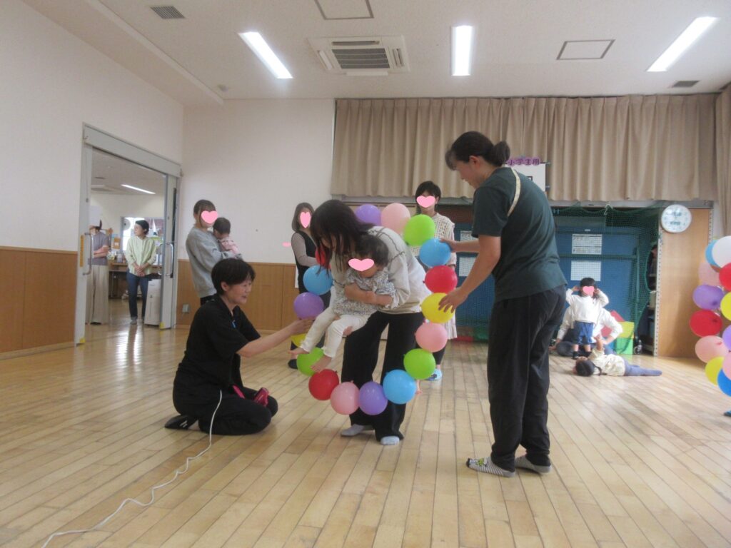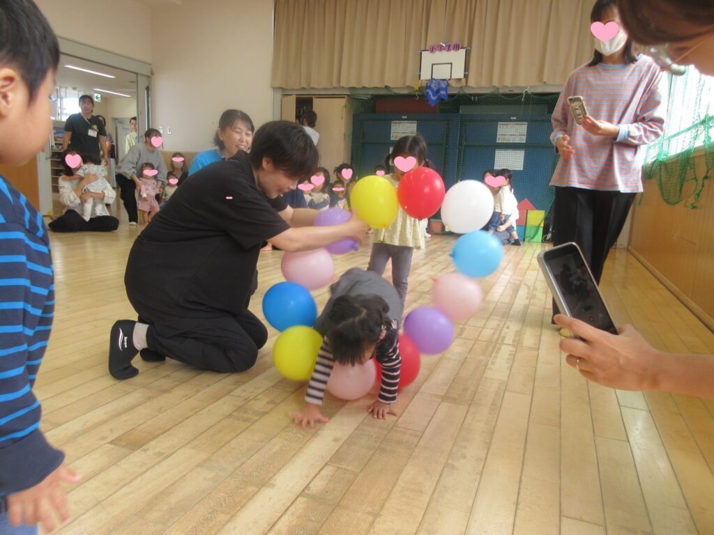 フラフープにボールを入れて親子で協力して引っ張ります!