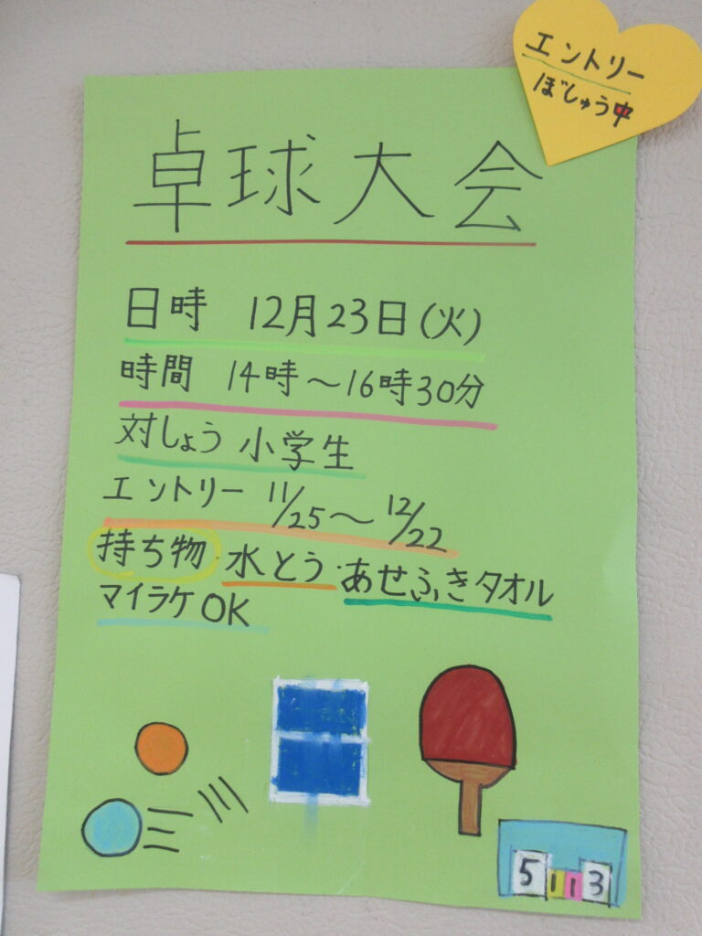 こども会議で開催が決まった「卓球大会」を12月23日午後2時から開催しました。当日の参加人数や学年を考慮した開催方法をこども会議に出席したメンバーや高学年のお友だちと職員で話し合いました。