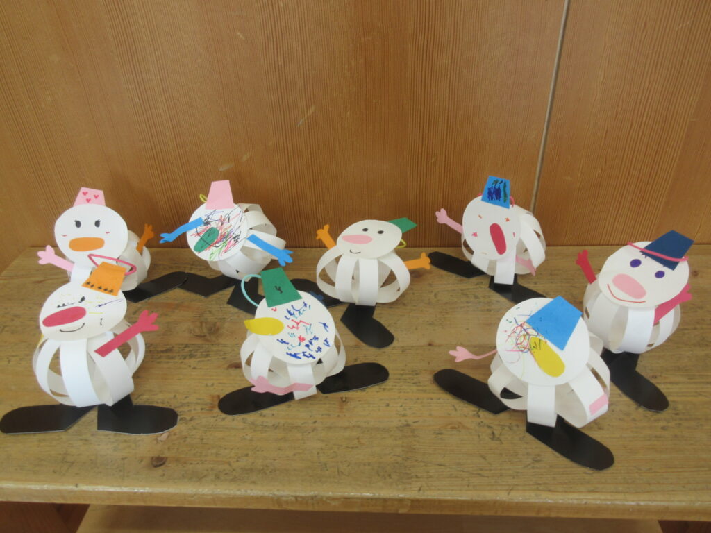 雪だるまのお顔をかいて各パーツを貼って作ります。