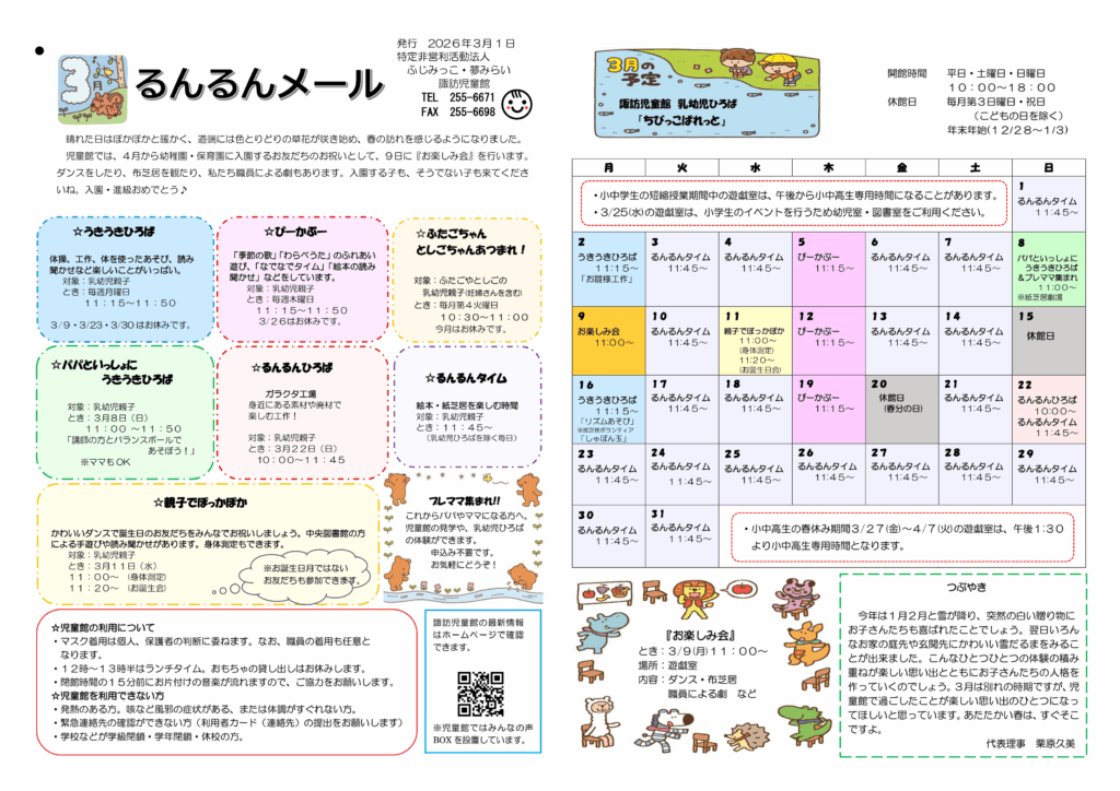 るんるんメール3月号(令和7年度) 2026 2/28 るんるんメール 諏訪児童館 2026年2月28日 るんるんめーる(諏訪)令和7年度3月号カラー版ダウンロード るんるんメール 諏訪児童館 2月のサークル支援 関連記事 2月のサークル支援 2026年2月27日 2月の諏訪児童館の様子 2026年2月27日 2月のちびっこぱれっと 2026年2月27日 職員募集のお知らせ 2026年2月25日 2月14日(土)のクッキングについて 2026年2月7日 1月のサークル支援 2026年1月30日 1月の児童館の様子 2026年1月30日 1月のちびっこぱれっと 2026年1月29日