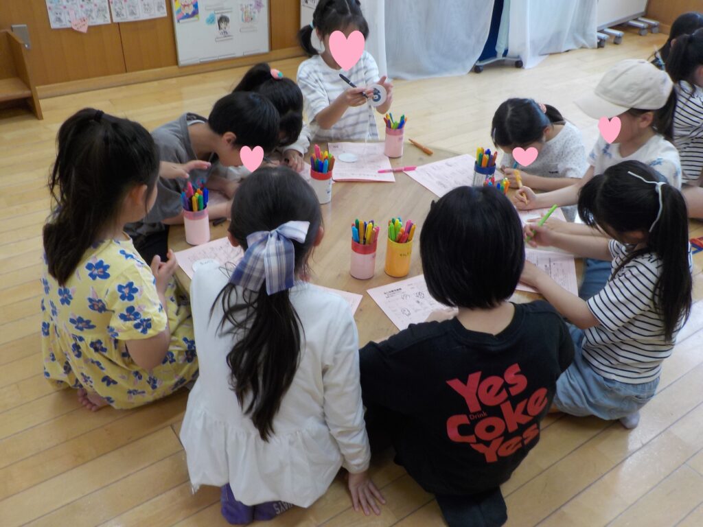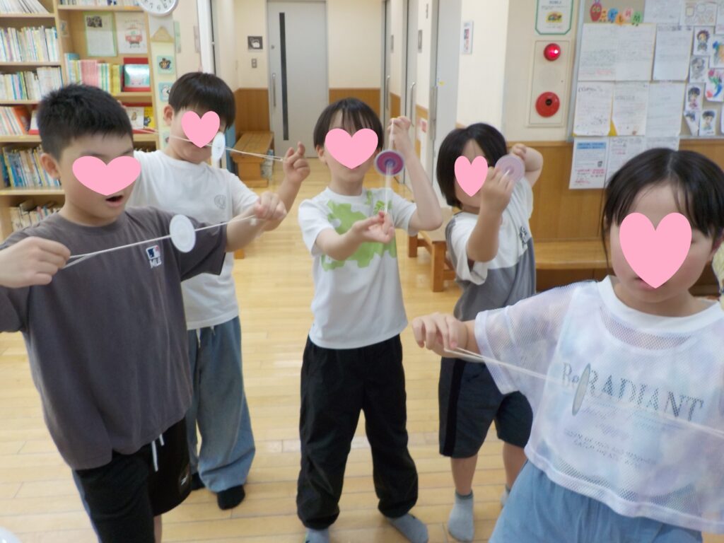丸い厚紙に模様や絵を描いて、紐を通して完成!長く回すにはコツが必要です。